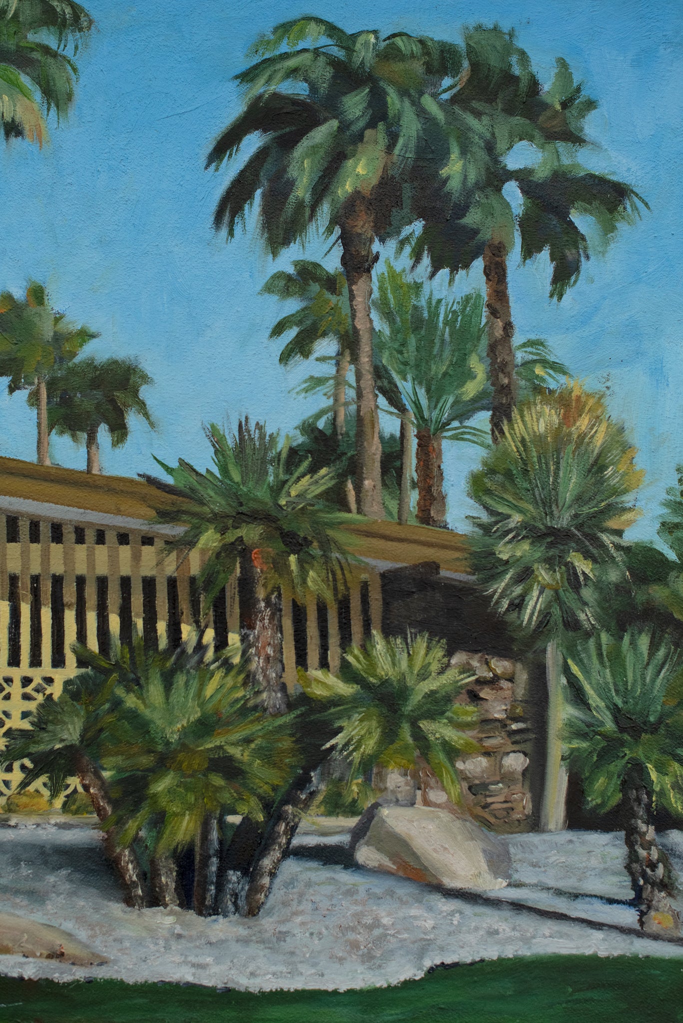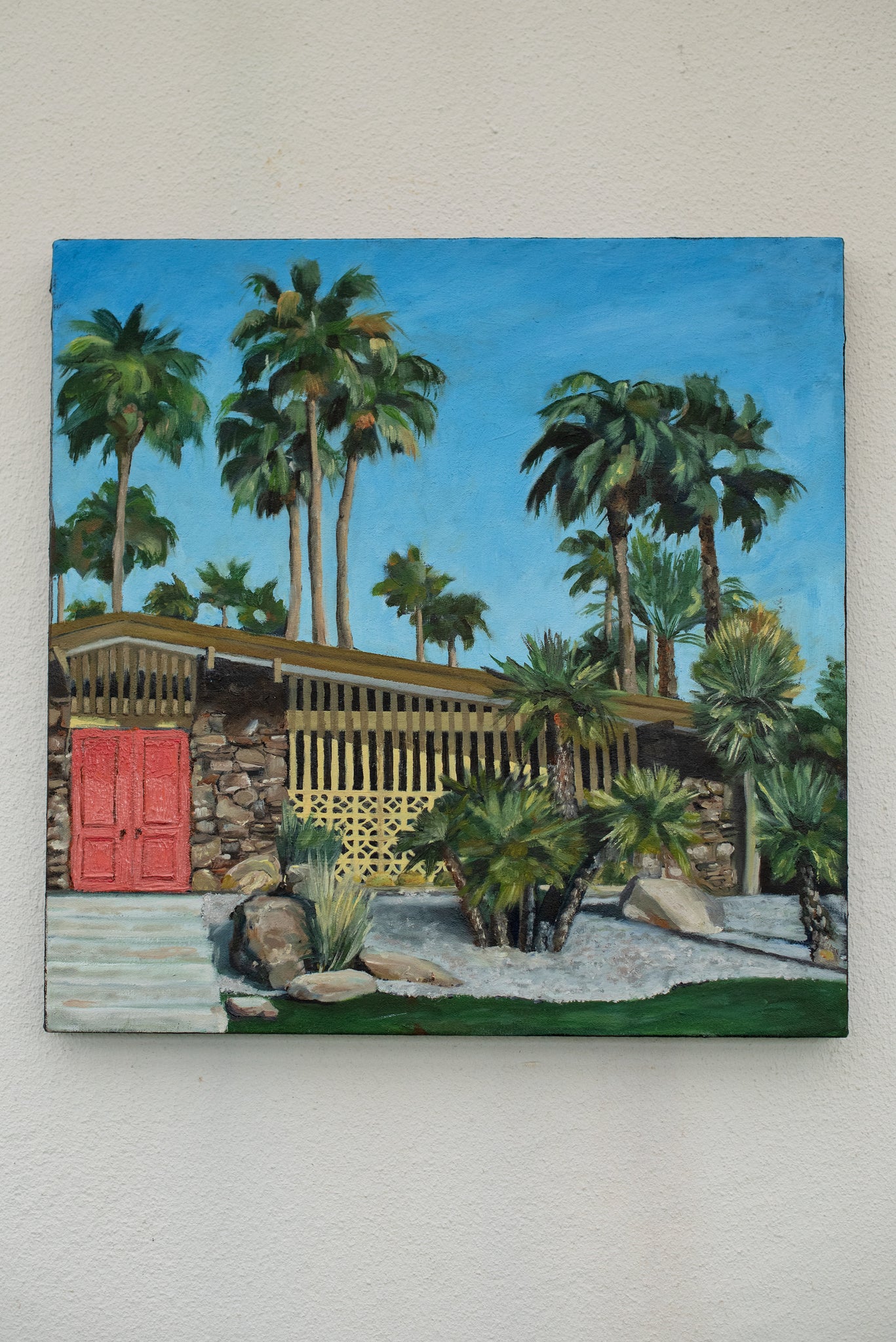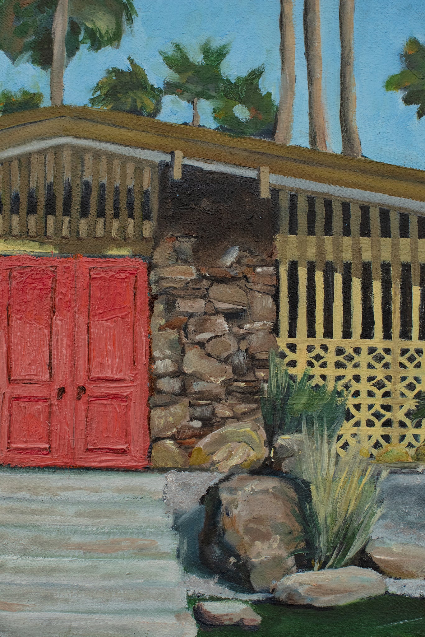I've always loved mid-century modern architecture, and while I was living in Durbanville until early this year, I lived in a house that was a classic example of this style which I adored. The house was near-unrenovated since it was built, so it still had yellow flass windows, orange carpets and wallpaper and leather concertina doors! I was surrounded by these types of houses in the Northern suburbs which was a big trend as the suburbs were developing between the 50s and 70s. I started to paint this piece in oils when I knew I'd be leaving the 'burbs behind and moving to a village where houses are more plaaslik and modest